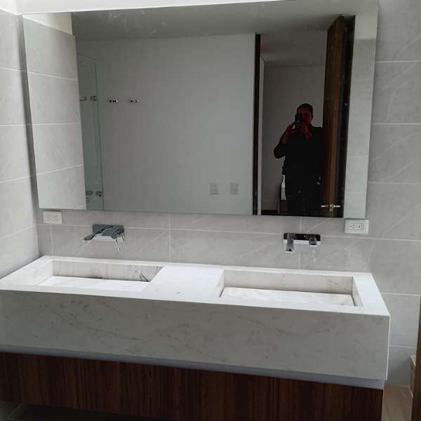 Elegancia clásica con bordes pulidos en ángulo. Ideal para baños, salas y vestidores.